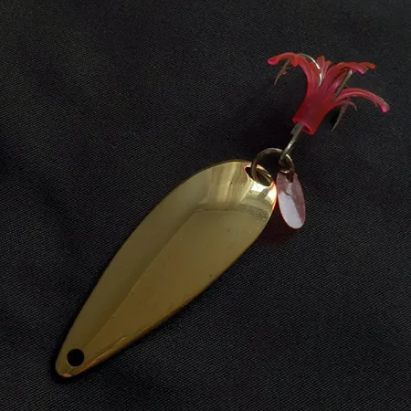 Auksuota danga suteikia ryškų blyksnį 2 1/4 colio (6 cm) lašo formos šios vintažinės vartiklės korpusui. 1/3 uncijos (10 g) svorio vartiklė, skirta tolimiems metimams, pasižymi solidžiu svoriu savo dydžiui, kas būdinga XX a. vidurio JAV gamintojo „Johnson“ produkcijai. Šis konkretus Johnson Sprite modelis (prekės kodas 22860) pasižymi unikalia komplektacija: trišakiu kabliu, papuoštu ryškiai rožiniu guminiu sijonėliu. Prie galinio žiedelio taip pat pritvirtinta maža raudona plastikinė viliojanti plokštelė, sukurianti papildomą akcentą auksiniam blizgiui. Masalo paviršius turi minimalių naudojimo žymių, tačiau išlaiko puikų atspindį, todėl jo būklė vertinama 4/5. Apatinėje pusėje esantis spaudas patvirtina kilmę bei modelį, tad tai yra puikiai išlaikyta žūklės istorijos dalis.