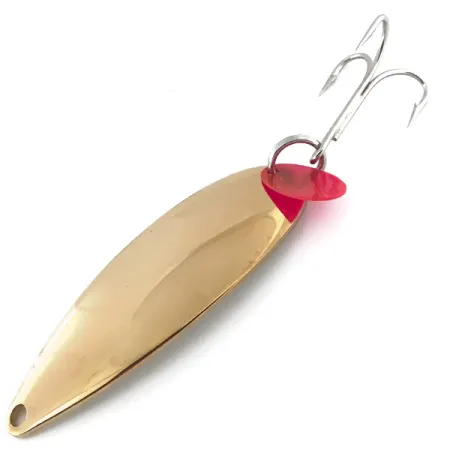 Aiškiai iškalta ant poliruoto paauksuoto korpuso nugarėlės, „Johnson Sprite“ pavadinimas žymi klasikinę Amerikos žvejybos įrankių istorijos dalį. Ši 10 cm (4") blizgė, sverianti 17 g (3/5 oz), reprezentuoja originalią prekės ženklo kokybę prieš perkeliant gamybą iš JAV į Kiniją. Atspindinti auksinė apdaila derinama su firminiu raudonu plastikiniu viliokliu prie žiedelio, sukurtu sukurti vizualinį atakos tašką šalia aštraus trišakio kabliuko. Kataloguotas prekės kodu 8851, šis egzempliorius išlieka puikios būklės, pelnęs 5/5 įvertinimą už švarų paviršių ir nepažeistas detales. Tiek žvejams, tiek kolekcininkams stora metalinė konstrukcija ir patikimas žiedelio surinkimas išskiria šiuos vintažinius modelius iš šiuolaikinių atitikmenų. Lašo formos profilis tinka įvairiems spiningavimo ir velkiavimo metodams.
