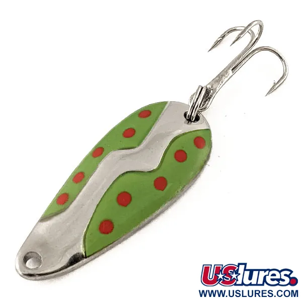 Nikeliuotas paviršius tarnauja kaip ryškus pagrindas kontrastingai Žalia / Nikelis apdailai ant šios 4,5 cm (1 3/4") blisgės. Kitoje pusėje aiškiai įspaustas Kamlooper pavadinimas ir Acme prekės ženklas, patvirtinantis, kad šis egzempliorius yra autentiškas JAV gamybos įrankis. 11 g (2/5 oz) sveriantis masalas pasižymi išskirtiniu banguotu raštu priekinėje dalyje, kur žali dažai akcentuojami mažais, ryškiai raudonais taškeliais. Šis konkretus pavyzdys, identifikuojamas prekės kodu 12168, yra puikios 5/5 būklės, išlaikęs poliruotą paviršių ir aštrų trišakį kabliuką, pritvirtintą per tvirtą žiedelį. Lašo formos profilis yra pagrindinis pasirinkimas žvejams, gaudantiems upėtakius ir lašišas, naudojant atspindintį nikelio paviršių, kuris papildo dažytas detales tolygiai traukiant ar velkiaujant.