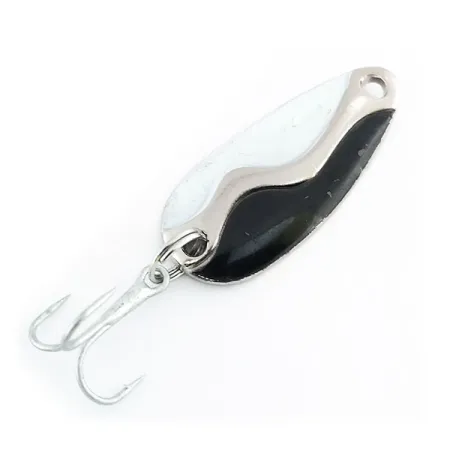 Ši JAV pagaminta blizgė, sverianti universalius 7 g (1/4 oz), pasižymi ryškiu trijų spalvų išdėstymu išgaubtoje pusėje. Apdaila padalinta į vientisą juodą ir baltą emalį, kuriuos skiria išskirtinai išlenkta poliruoto nikelio bangos linija, einanti per visą korpusą. 3,5 cm (1 1/2") ilgio „Acme“ kūrinys, atpažįstamas pagal produkto kodą 9801, turi aiškiai matomą gamintojo pavadinimą ir modelio spaudą kitoje pusėje. Didelio kontrasto Juoda / Balta / Nikelis raštas suteikia stiprų vizualinį blyksnį metant ar velkiaujant. Kalbant apie furnitūrą, blizgė turi tvirtą žiedelį ir aštrų trišakį kabliuką. Šis egzempliorius yra puikios būklės (įvertinimas 5/5), dažai ir nikelio danga išlaikę pradinį blizgesį. Pagaminta JAV, konstrukcija pabrėžia patvarų metalo apdirbimą ir kokybišką apdailą, būdingą vintažiniams „Acme“ reikmenims.