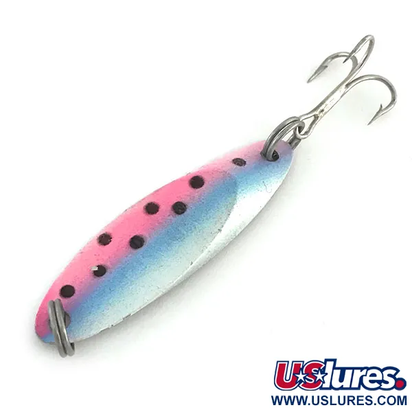 Nikelio pagrindas suteikia intensyvų blyksėjimą šios 7 g (1/4 oz) blizgės upėtakio spalvinimui. Pagaminta JAV (produkto kodas 9340), originali Acme konstrukcija remiasi specialiu metalo lydiniu, užtikrinančiu stabilų balansą traukiant ar skęstant. Upėtakio raštas pasižymi ryškiais rožiniais ir mėlynais perėjimais palei viršutinį kraštą bei juodais taškeliais, imituojančiais smulkią žuvelę. 4,5 cm (1 3/4 colio) ilgio masalas yra universalus pasirinkimas gaudant plėšrūnus giliuose vandenyse ar stiprioje srovėje, kur reikalingas tankus, aerodinamiškas profilis. Dažų ir metalo danga yra puikios būklės (įvertinimas 5/5). Masalas apginkluotas tvirtu trišakiu kabliuku, pritvirtintu per sustiprintus žiedelius abiejuose galuose.