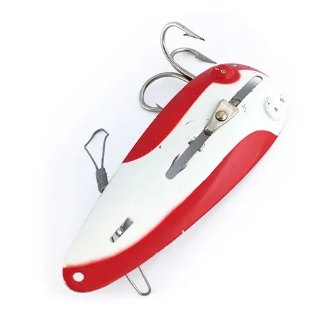 Ryškus raudonai baltas dažymas dengia viršutinį šios 25 g (1 uncijos) „Katch King“ blizgės, sukurtos dar 1958 m., paviršių. Pagaminta JAV (produkto kodas 9948), 9 cm (3 1/2 colio) korpusas turi poliruotą nikelio apačią. Šis pavyzdys pasižymi savo transformuojama konstrukcija; viršutinėje dalyje esantis slankiojantis mechanizmas leidžia žvejui įjungti apsaugą nuo žolių, pritaikant masalą metimams per augmeniją arba atvirame vandenyje. Apdaila yra išskirtinai gerai išsilaikiusi (būklės įvertinimas 5/5), su ryškiomis spalvomis ir švariais metaliniais paviršiais. Konfigūraciją sudaro galinis trišakis kablys ir vidinė apsaugos nuo žolių sistema, integruota į įgaubtą rėmą.