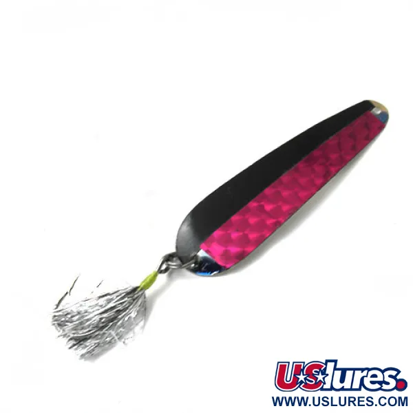 Ši 8 cm (3 1/4") ilgio velkiavimo blizgė pasižymi lieknu metaliniu korpusu ir išskirtiniu dviejų dalių spalviniu sprendimu. Kausch 14, pažymėta produkto kodu 0444, nugarinėje pusėje turi poliruoto nikelio apdailą, o jos priekis padalintas į sodriai juodą viršutinę pusę ir ryškiai raudoną žvynų rašto juostą apatinėje dalyje. 3,7 g (1/8 oz) sverianti JAV gamybos masalas yra subalansuotas velkiavimui, kai reikalingas siauras ir pailgas profilis. Sidabrinis blizgučių (tinsel) priedas pritvirtintas prie galinio žiedelio neoninės geltonai žalios spalvos apvija, suteikiančia pluošto blyksnį, kontrastuojantį su kietais atspindinčiais paviršiais. Šis konkretus egzempliorius yra 4/5 būklės, dekoratyviniai žvynai ir nikelio danga išlieka ryškūs ir aiškūs. Tvirtinimo taškas ties galvute yra paprasta išmušta kilpelė, būdinga gamintojo tiesmukam dizainui, skirtam specializuotai velkiavimo įrangai.
