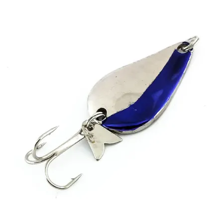 Giliai chromuotoje apačioje įspaustas „K.O. WOBBLER“ pavadinimas žymi šią 3,5 cm (1 1/2") blizgę kaip klasikinį „Acme“ JAV gamybos asortimento modelį. Išgaubta pusė pasižymi ryškiu kontrastu tarp poliruoto sidabrinio pagrindo ir sodrios metalizuotos mėlynos juostos. 7 g (1/4 oz) svorio storas metalinis korpusas užtikrina masalo tankį, reikalingą tolimiems metimams ir giliam traukimui. Pagrindinė 9764 modelio ypatybė – maža metalinė uodegėlė, pritvirtinta prie galinio žiedelio kartu su trišakiu kabliuku, kuri sukuria papildomus blyksnius ir mechanines garso vibracijas. Šis egzempliorius vertinamas 5/5, pasižymi nepriekaištinga dažytų ir štampuotų paviršių būkle. Kiekvienas komponentas, nuo viršutinio žiedelio iki gamyklinio trišakio, atitinka aukštus kokybės standartus, kurių „Acme“ laikėsi savo JAV gamyklose.