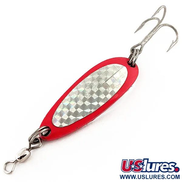Ši 9 g (1/3 oz) svorio „Luhr Jensen Krocodile“ pasižymi ryškiu sodrios raudonos spalvos ir stipriai šviesą atspindinčio holografinio žvynų rašto deriniu. 4 cm (1 1/2") ilgio blizgė yra klasikinė mėtymui skirta priemonė, pagaminta iš šiam prekės ženklui būdingo storasienio metalo. Šis konkretus pavyzdys, pažymėtas prekės kodu 11949, turi perlamutrinių žvynų vidinį intarpą raudonai apvadintame rėmelyje, užtikrinantį tiek ryškų siluetą, tiek atspindintį spindesį. Furnitūra itin švari: tvirti jungiamieji žiedeliai, stiprus trišakis kablys ir integruotas suktukas, apsaugantis valą nuo susipynimo traukimo metu. Siauras, pailgas profilis sukurtas siekiant maksimalaus atstumo, todėl lengva atlikti tolimus metimus nuo prieplaukų ar valčių į gilesnius vandens sluoksnius. Įvertintas 5/5 būkle, masalas išlaikė originalų gamyklinį blizgesį tiek ant dažytų paviršių, tiek ant holografinės juostos. Viena pusė pasižymi languotu prizminiu efektu, o kita – lygiu, spalvingu holografiniu švytėjimu, kuris pagauna šviesą bet kuriuo kampu.