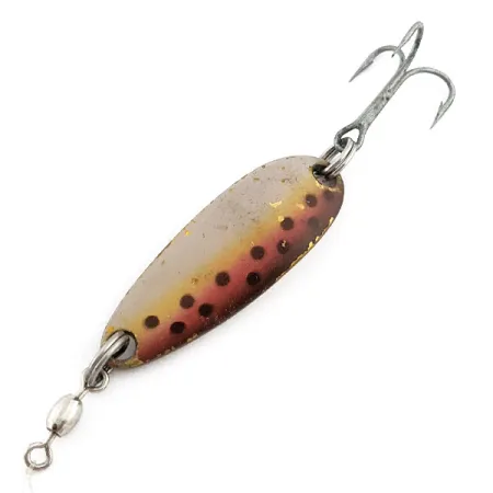 Ant poliruotos žalvarinės nugarėlės aiškiai iškalti „LUHR JENSEN“ ir „KROCODILE“ ženklai patvirtina šios 1 1/2" (4 cm) vartiklės kilmę. Šis konkretus egzempliorius, pažymėtas gaminio kodu 22434, pasižymi detaliu „Brown Trout“ dažymu su šiltu rausvai oranžiniu šoniniu dryžiu ir tamsiomis dėmėmis ant metalinio paviršiaus. 1/3 oz (9 g) svoris yra puikiai subalansuotas spiningavimui, velkiavimui arba vertikaliam blizgiavimui. Masalo komplektaciją sudaro statinaitės formos suktukas ant priekinio žiedelio ir aštrus trišakis kablys gale, todėl jis paruoštas tiek žūklei, tiek kolekcijai. Kalbant apie išsaugojimą, būklė vertinama solidžiais 4/5 balais – švarus paviršius atspindi kokybišką JAV gamybą. Šis dizainas labai vertinamas kolekcininkų dėl universalaus profilio, kuris išlaiko stabilų žaidimą tiek lėtai traukiant, tiek velkiaujant didesniu greičiu.