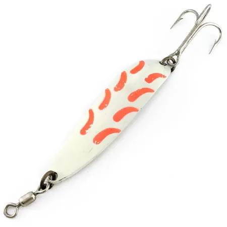 Ši 28 g sverianti masyvi metalinė blizgė išlieka viena universaliausių konstrukcijų, sukurtų tiek spiningavimui, tiek velkiavimui. Šios 8,5 cm ilgio Luhr Jensen Krocodile #5 korpusas pasižymi ryškiu baltos ir oranžinės spalvos UV raštu priekinėje dalyje, skirtu padidinti matomumą giliame ar drumstame vandenyje. Šis JAV pagamintas modelis, pažymėtas prekės kodu 21107, sukomplektuotas su originalia furnitūra, įskaitant tvirtą trišakį kabliuką ir suktuką, apsaugantį nuo valo susisukimo. Vidinė pusė padengta poliruotu chromu, sukuriančiu ryškų blyksnį, kontrastuojantį su dažytu paviršiumi. Įvertinta puikiai (5/5), masalas pasižymi nepriekaištinga originalia danga ir furnitūra. Siaura, smailėjanti forma yra būdinga Krocodile serijai, leidžianti sėkmingai žvejoti giliose vietose ir atlikti tolimus metimus.