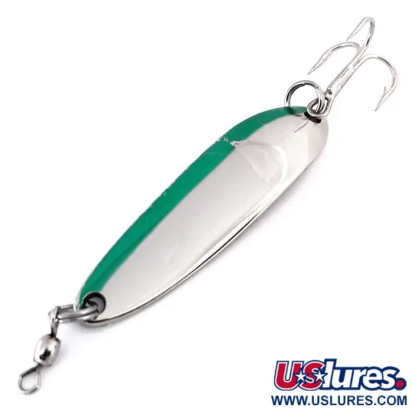Žali dažai dengia lygiai pusę šios grakščios blizgės ilgio, ryškiai kontrastuodami su poliruota nikelio apdaila kitoje pusėje. Ši Luhr Jensen Krocodile Die #3, atpažįstama pagal prekės kodą 10297, išlieka mėgstama žvejų, kuriems reikia pasiekti gylį metant ar velkiaujant lašišas. Kitoje pusėje yra aiškus, klasikinis Krocodile logotipo įspaudas kartu su paminėtu Hood River, Oregon, paveldu. 5,5 cm (2 1/4") ilgio ir 10 g (1/3 oz) svorio blizgė dėl storesnio metalo konstrukcijos skęsta ir išlaiko gylį efektyviau nei plonesnės standartinės blizgės. Šis egzempliorius yra 5/5 būklės, pasižymintis puikiu veidrodiniu nikelio atspindžiu ir ryškiu, nepažeistu spalvos sluoksniu. Blizgė komplektuojama su tvirtu trišakiu kabliu ir gamykliškai sumontuotu sukučiu, skirtu išvengti valo susisukimo.