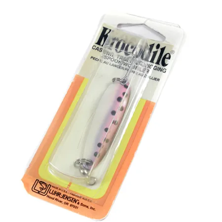 Nikelio danga suteikia pagrindinį blizgesį šiam vaivorykštinio upėtakio raštui, sukurdama didelio kontrasto pateikimą lašišoms ar upėtakiams. Šis Luhr Jensen Krocodile Die #3 yra 2 1/4" (5,5 cm) ilgio ir sveria 1/3 oz (10 g) – toks profilis optimizuotas tiek tolimiems metimams, tiek kontroliuojamam vilkimui. Atpažįstama pagal prekės kodą 2073, ši blisgė pasižymi rausvų ir sidabrinių atspalvių gradientu su ryškiomis juodomis dėmėmis, tiksliai imituojančiomis jauną upėtakį. Masalas nenaudotas ir išlikęs originalioje retro lizdinėje plokštelėje iš Luhr Jensen & Sons gamyklos Hood River, Oregone. Storos sienelės metalas užtikrina ryškų svyravimą traukiant, todėl masalas išlieka pastebimas net medžiojant galingas žuvis. Įrangą sudaro tvirtas žiedelis ir aštrus trišakis kablys – prekės ženklo patikimumo ženklai. Ant kortelės yra klasikinė žyma „Made in USA“, žyminti šį masalą kaip Amerikos žūklės istorijos dalį.