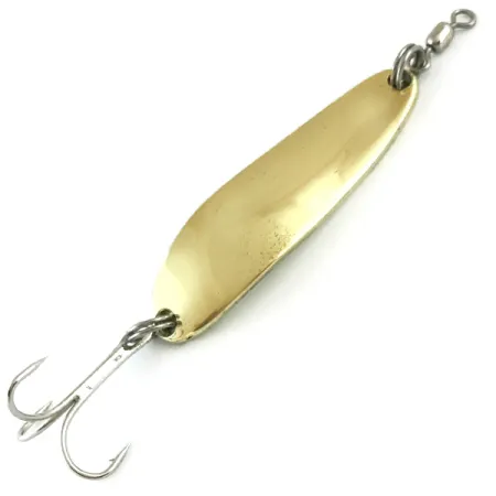 Metale aiškiai įspausti Luhr Jensen ir Krocodile pavadinimai išsiskiria šios 1/2 oz (14 g) blizgės nugarėlėje. Šis Die #3 modelis, kataloguojamas kodu 5781, pasižymi siauru lašo formos profiliu, kurio ilgis 5,5 cm (2 1/4"). Poliruota auksinė apdaila yra išskirtinai švari visame korpuse, atspindinti gamybos kokybę, siejamą su Luhr Jensen paveldu Ramiojo vandenyno šiaurės vakaruose. Blizgė sukomplektuota su statinės formos suktuku viršutiniame žiede ir sidabrinio atspalvio trišakiu kabliuku gale. Šis egzempliorius yra 5/5 būklės, pasižymintis itin blizgiu paviršiumi, kuris išlieka ryškus ir atspindintis šviesą. Gamintojas sąmoningai pasirinko storą metalą, kad padėtų žvejams pasiekti gilesnius vandens sluoksnius tolygiai traukiant masalą. Kiekviena detalė, nuo aiškaus prekės ženklo įspaudo iki tvirtos furnitūros, rodo puikiai išlaikytą žvejybos istorijos dalį.