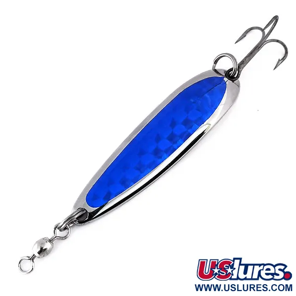 Ryški mėlyna holografinė prizminė juosta dengia viršutinę šios 19 g (2/3 uncijos) vartiklės pusę, sudarydama ryškų kontrastą su poliruoto nikelio apdaila kitoje pusėje. Pagaminta „Luhr Jensen“ JAV, šis egzempliorius yra Krocodile Die #4, duomenų bazėje sekamas prekės kodu 10296. 6,5 cm (2 1/2") korpusas yra pažymėtas klasikiniu „KROCODILE“ Die #4 spaudu, nurodančiu gamintojo vietą Hood River, Oregone. Furnitūrą sudaro gamykloje sumontuotas sukutis priekyje ir tvirtas trišakis kablys, pritvirtintas sustiprintu žiedeliu. Šis konkretus Nikelio / Mėlynas spalvinis derinys dažnai pasirenkamas žvejų, gaudančių lašišas ar upėtakius skaidriame vandenyje, kai reikalingas didelis svoris gyliui pasiekti. Paviršiai ir kablys yra puikios būklės (5/5), pasižymi švariu, atspindinčiu blizgesiu ant metalo ir juostos. Kiekvienas įspaudas yra aiškus ir gilus, atspindintis aukštus istorinius „Luhr Jensen“ gamybos standartus.