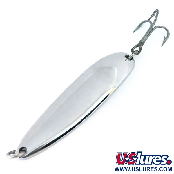 Ši 8,5 cm (3 1/4") ilgio klasikinė Luhr Jensen blizgė pasižymi aptakiu profiliu, pritaikytu itin tolimiems metimams. Sunkaus metalo korpusas, pažymėtas „KROCODILE DIE #4“ įspaudu, sveria 19 g (2/3 oz), todėl puikiai tinka pasiekti gilius vandenis arba gaudyti lašišas nuo prieplaukų. Nickel spalva sukuria nuolatinį, veidrodinį blyksėjimą, kuris yra esminis vizualinis dirgiklis plėšrūnams tiek gėluose, tiek sūriuose vandenyse. Pagaminta Hudo Riveryje, Oregone, ši blizgė atspindi senosios JAV gamybos kokybę, turi tvirtą trišakį kabliuką ir patikimą žiedelį. Būklė vertinama 5/5 – paviršius idealiai atspindi šviesą, be jokių naudojimo žymių. Siaura, smailėjanti forma yra būdinga Krocodile serijai, todėl ji efektyvi spiningaujant, velkiaujant ar net vertikaliai džigaujant. Kitoje pusėje esantys įspaudai su gamintojo pavadinimu, 11054 kodu ir kilmės vieta yra svarbios detalės kolekcionieriams, vertinantiems autentiškus Luhr Jensen gaminius.