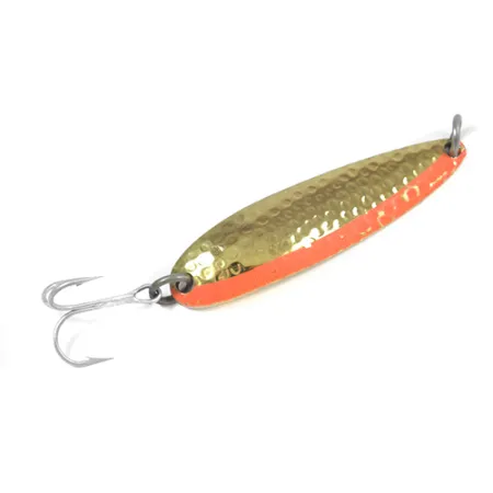 Mušto aukso tekstūros pagauna šviesą ant šios klasikinės blizgės išgaubtosios pusės, specialiai sukurtos žvejams, kuriems reikia metimo nuotolio ir gylio. Ši 17 g (3/5 oz) svorio ir 6,5 cm (2 1/2") ilgio Luhr Jensen Krocodile Die #4 pasižymi storu ir siauru profiliu, tinkančiu tiek spiningavimui, tiek velkiavimui. Ryški oranžinė juosta eina palei vieną mušto paviršiaus kraštą, sudarydama ryškų vizualinį kontrastą su atspindinčiu metaliniu korpusu. Ant lygaus vidinio paviršiaus aiškiai įspaustas kultinis „KROCODILE“ pavadinimas kartu su Luhr Jensen ženklu bei kilmės vieta Hood River, Oregonas – detalė, kurią kolekcininkai vertina tikrindami vintažinį autentiškumą. Šis egzempliorius, pažymėtas prekės kodu 2085, yra 5/5 būklės, turi švarų trišakį kabliuką ir tvirtus žiedelius. Die #4 svorio paskirstymas leidžia jai išlaikyti poziciją vandens sluoksnyje net ir traukiant per sraunesnę srovę.