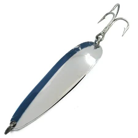 Veidrodinis nikelio paviršius, pabrėžtas švaria mėlyna juostele išilgai krašto, apibūdina šią 6,5 cm (2 1/2") Krocodile Die #4 vartiklę. 19 g (2/3 oz) svorio Luhr Jensen dizainas pasižymi storesniu ir siauresniu profiliu nei standartinės vartiklės, specialiai sukurtas skrosti vėją tolimų metimų metu arba pasiekti gilesnes zonas velkiuojant. Vartiklės nugarėlėje yra ryškus „KROCODILE“ antspaudas kartu su „LUHR JENSEN HOOD RIVER, ORE“ prekės ženklu, nurodančiu jos USA kilmę. Aprūpintas tvirtu trišakiu kabliuku, pritvirtintu per tvirtą žiedelį, šis egzempliorius įvertintas 5/5 būkle ir yra nenaudotas. Identifikuotas produkto kodu 5599, sunkus masalo korpusas leidžia išlaikyti stabilumą esant įvairiems traukimo greičiams. Mėlynas krašto akcentas suteikia subtilų kontrastą blizgančiam nikelio korpusui – tai klasikinė kombinacija, dažnai naudojama gaudant lašišas ir plienagalvius upėtakius tiek gėluose vandenyse, tiek pakrančių zonose.