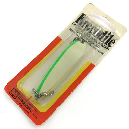 Sverianti 2/3 oz (19 g), Luhr Jensen & Sons Krocodile Die #4 Glow yra viena iš tų universalių blizgių, kurias kiekvienas žvejys vertina dėl puikių metimo savybių net ir pučiant stipriam vėjui. 2 1/2" (6,5 cm) ilgio storas metalinis korpusas yra nudažytas šviesiai balta spalva su neonine žalia juostele šone, kuri tamsiame vandenyje virsta ryškiai švytinčia liuminescencine žalia spalva. Šis konkretus masalas, kurio produkto kodas 5971, yra originalioje pakuotėje ir nenaudotas. Priešingai nei lengvos „flutter“ tipo blizgės, ši konstrukcija skirta spiningavimui, trolingui ir net vertikaliam džigavimui. Furnitūra yra itin tvirta: priekyje sumontuotas tvirtas žiedelis, o gale – suktukas su guoliu, kad būtų išvengta valo sukimosi traukiant masalą. Tai Oregone, Hood River gamykloje pagamintas produktas, todėl ant metalinio korpuso galinės dalies yra klasikinė „Made in USA“ žymė.