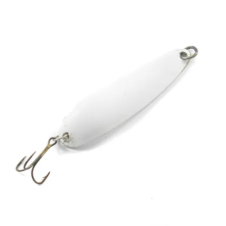 Masyvi, storų sienelių metalinė konstrukcija leidžia 21g (3/4oz) Krocodile Die #5 pasiekti didelius atstumus metant arba nerti į reikšmingą gylį velkiaujant. Šis 8,5cm (3 1/4") modelis pasižymi švaria, vientisa balta apdaila, kuri užtikrina didelio kontrasto profilį įvairiomis vandens sąlygomis. Kitoje masalo pusėje matomas gilus 'KROCODILE DIE #5' įspaudas kartu su Luhr Jensen prekės ženklu ir kilmės vieta – Hood River, Oregonas, o tai aiškus JAV gamybos įrodymas. Die #5 serijai būdingas storesnis ir siauresnis profilis traukiant sukuria ryškų siūbuojantį judesį, imituojantį gyvą masalą. Originali furnitūra, įskaitant trišakį kabliuką ir žiedelius, išlieka puikios 5/5 būklės. Kataloge pažymėta produkto kodu 1792, vientisa balta danga yra pagrindinis žvejų pasirinkimas, kai reikia matomumo esant debesuotumui ar drumstam vandeniui. Įspaustos detalės įgaubtoje pusėje išlieka ryškios ir įskaitomos, pabrėžiant praktišką šio klasikinio Luhr Jensen masalo dizainą.