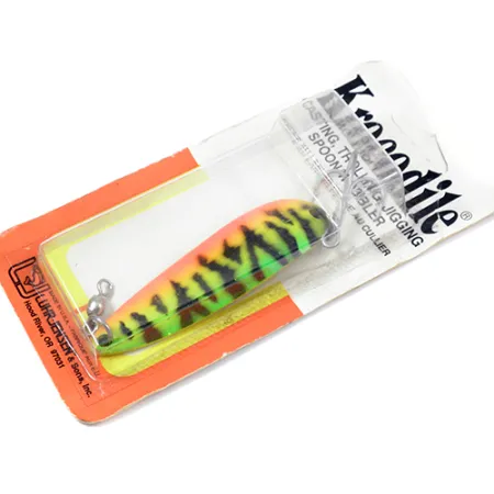 Ši 8,5 cm (3 1/4") ilgio tvirta vartiklė yra nepakeičiama žvejams, siekiantiems plėšrūnus giliuose vandenyse. Ryškūs juodi tigro dryžiai ant neoninės žalios ir oranžinės spalvos gradiento apibūdina Fire Tiger raštą ant šios Krocodile Die #5 – tai apdaila, skirta matomumui drumstame vandenyje. Šis egzempliorius, kurio prekės kodas 1978, yra nenaudotas ir išlikęs originalioje Luhr Jensen & Sons pakuotėje iš Hood River, Oregono. Storo metalo konstrukcija sukurta universalumui, o gamyklinė pakuotė aiškiai pabrėžia jos naudojimą mėtymui, velkiavimui ir džigavimui. Sverdama 21 g (3/4 oz), ši vartiklė pasižymi tankiu, reikalingu tolimiems metimams pučiant stipriam vėjui arba norint pasiekti gylį srovėje. Furnitūrą sudaro suktukas priekyje, mažinantis valo susisukimą, ir stiprus žiedelis gale. Pakuotės nugarėlėje išlikusi originali inventorinė etiketė, patvirtinanti spalvos ir dydžio specifikacijas. Skaidri pakuotė išsaugojo ryškius dažus ir blizgančius metalinius paviršius.