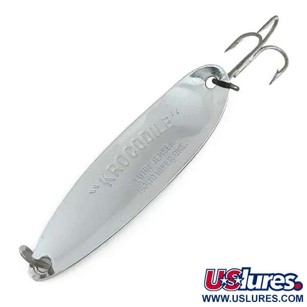 28 g (1 oz) svorio masyvus metalinis korpusas užtikrina tankį, reikalingą tolimiems metimams pučiant stipriam vėjui. Poliruotas nikelio sluoksnis išgaubtoje pusėje papuoštas ryškiai žaliu „Frog“ taškuotu raštu – tai klasikinė spalvų konfigūracija įvairioms apšvietimo sąlygoms. 8,5 cm (3 1/4") ilgio „Die #5“ dydis pasižymi solidžiu profiliu, tinkamu giliavandeniams plėšrūnams. Įgaubta pusė atskleidžia „Luhr Jensen“ palikimą, čia išspaustas „KROCODILE“ prekės ženklas ir gamybos vieta – Hood River, Oregonas. Visa furnitūra, įskaitant priekinį žiedelį ir didelį trišakį kablys gale, yra nepažeista ir funkcionali. Šis egzempliorius pažymėtas prekės kodu 8002 ir yra 5/5 būklės. Nikelio pagrindo atspindinčios savybės išlieka ryškios, sudarydamos didelį kontrastą dažytiems žaliems akcentams.