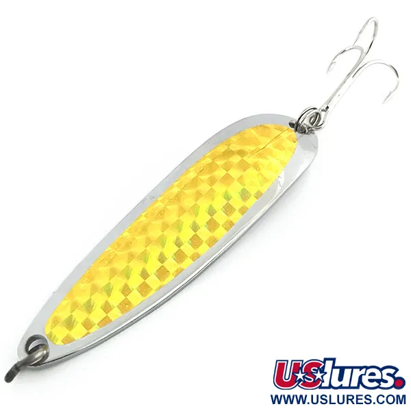 Ši klasikinė 1 oz (28 g) svorio blizgė, skirta spiningavimui ir velkiavimui, yra nepakeičiama žvejojant giliuose vandenyse, kur metimo nuotolis yra itin svarbus. 3 1/4" (8,5 cm) korpusas padengtas blizgančia Nikelio / Auksinės hologramos danga, kurios geometrinis prizmės raštas pagauna ir atspindi šviesą. Įgaubtoje pusėje aiškiai išmuštas Luhr Jensen Hood River, Oregon prekės ženklas. Šis konkretus pavyzdys (produkto kodas 8766) pasižymi tvirta metalo konstrukcija, kuria garsėja šis gamintojas. Žvejai dažnai renkasi šį modelį dėl jo gebėjimo skrosti vėją atliekant tolimus metimus nuo kranto. Įrangą sudaro tvirtas žiedelis priekyje ir tvirtas trišakis kablys gale. Masalo būklė yra 5/5, atspindintys paviršiai ir auksinė žvynelių juosta išliko ryškūs ir puikiai išlaikyti.
