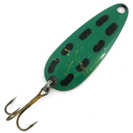 Ant žalvario atspalvio nugarėlės aiškiai išspaustas žymėjimas „LEN THOMPSON NO. 0“ identifikuoja šį Kanadoje pagamintą lobį. 6,5 cm (2 1/2") ilgio blizgė pasižymi klasika tapusiu žaliu paviršiumi, paįvairintu ryškiomis juodomis dėmėmis ir auksiniais taškeliais, imituojančiais natūralų grobį. Sverianti 17 g (3/5 oz), ji sukurta lėtam siūbavimui, dėl kurio dešimtmečius yra nepakeičiama gaudant lydekas ir ežerinius upėtakius. Šis konkretus egzempliorius, kurio prekės kodas 6765, yra 4/5 būklės, su puikiai išsilaikiusiais dažais išgaubtoje pusėje ir švaria auksine apdaila įgaubtoje vidinėje dalyje. Furnitūrą sudaro tvirtas žiedelis ir senovinis trišakis kablys, kuris išlieka struktūriškai tvirtas. Nuo 1929 m. Len Thompson teikia pirmenybę šios blizgės balansui, todėl ji yra patikimas pasirinkimas tiek spiningavimui, tiek velkiavimui įvairiomis gėlo vandens sąlygomis.