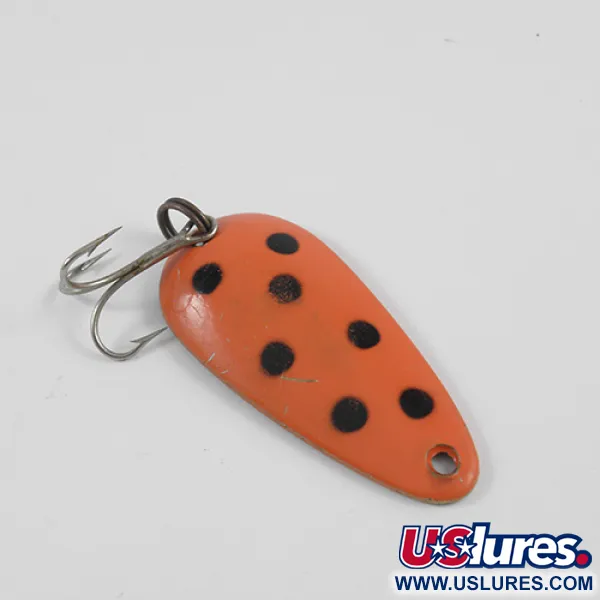 Papuošta drąsiu šešių juodų taškų raštu ant ryškios oranžinės-raudonos apdailos, ši Kanadoje pagaminta blizgė tęsia dizaino tradiciją, kuri yra žvejybinių dėžučių pagrindas nuo 1929 metų. 1/2 oz (14 g) svorio lašo formos žalvarinis korpusas yra 2" (5,0 cm) ilgio, todėl tai universalus pasirinkimas tiek spiningavimui, tiek velkiavimui. Kitoje masalo pusėje yra klasikinė gilaus spaudimo gamintojo žymė, nurodanti, kad tai Len Thompson #00 modelis. Dažų apdaila išlieka stebėtinai ryški, o esant 4/5 būklės įvertinimui, masalas turi tik lengvus naudojimo požymius, išlaikydamas ryškų, atspindintį žalvarinį paviršių kitoje pusėje. Jame sumontuotas tvirtas žiedelis ir originalus trišakis kabliukas, skirti išnaudoti lėtą siūbuojantį darbą, būdingą šiai specifinei masalinės žuvies imitacijai. Kolekcionieriai atpažins išskirtinę furnitūrą ir štampavimą, susijusį su produkto kodu 2579.