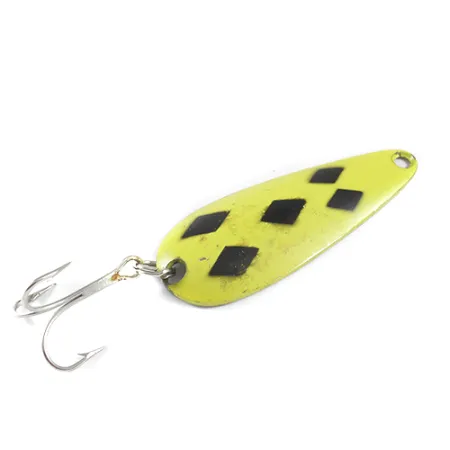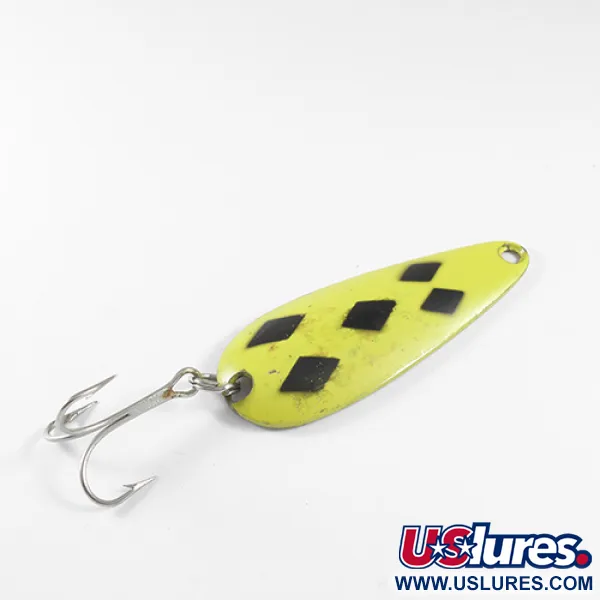 Penki juodi rombai, išdėstyti klasikiniu raštu ant ryškiai geltonos dangos, apibrėžia šios Kanadoje pagamintos vartiklės estetiką. Sverdama 3/4 oz (21 g) ir būdama 2 3/4" (7 cm) ilgio, ši #1 dydžio vartiklė pasižymi ryškiu profiliu, skirtu lydekų ar ežerinių upėtakių žūklei. Žalvario apdailos nugarėlėje įspaustas gamintojo Len Thompson pavadinimas, kurio gamybos paveldas šiame regione siekia 1929 metus. Šis egzempliorius, kurio prekės kodas 1748, turi nedidelių dažų ir metalo nusidėvėjimo požymių, tačiau išlieka 4/5 būklės. Sidabrinio atspalvio trišakis kabliukas pritvirtintas gale per tvirtą žiedelį, todėl masalas paruoštas spiningavimui ar velčiavimui. Specifinis metalo išlenkimas sukurtas taip, kad traukiant masalą jis lėtai vartytųsi. Žalvarinis pagrindas lieka matomas kitoje pusėje, sukurdamas subtilų blyksnį, kontrastuojantį su ryškiai geltonu priekiniu paviršiumi.