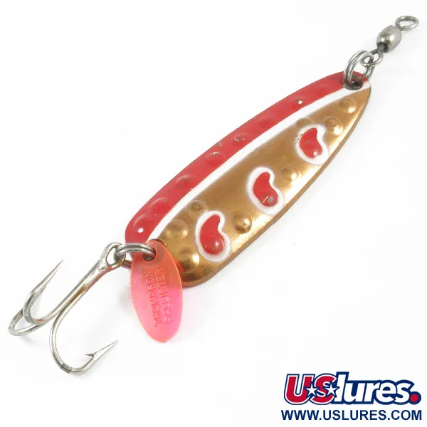 Vario danga su įspaustais duobelėmis kitoje pusėje pabrėžia tradicinį Kanados masalų gamybos meistriškumą. Sverdama 25g (1oz) ir būdama 7cm (2 3/4") ilgio, ši Len Thompson #13 pasižymi išskirtiniu raudonai baltu lašo formos raštu ant poliruoto vario korpuso. Šis konkretus gaminys, pažymėtas prekės kodu 3287, yra 5/5 būklės, pasižymi ryškiu blizgesiu ir gerai išlikusiais dažais. Komplektaciją sudaro tvirtas trišakis kablys su permatomu rožiniu viliokliu ir padidinto atsparumo suktukas ant priekinio žiedo. Įgaubtoje vidinėje pusėje gamintojo ženklas aiškiai įspaustas į metalą tarp tekstūruoto paviršiaus. Ši blizgė sukurta universalumui, ji dažnai naudojama spiningaujant ar velkiaujant gaudant lydekas, lašišas ir ežerinius upėtakius.