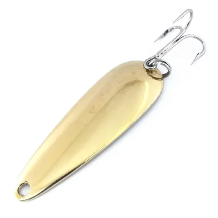 3 1/4" (8 cm) ilgio masyvi metalinė blizgė yra padengta ryškiu auksu, užtikrinančiu stiprų metalinį žvilgesį vandenyje. Ši Len Thompson #2, kurios prekės kodas 10732, sveria 1 oz (28 g), todėl puikiai tinka žvejoti gilesnėse vietose tiek spiningaujant, tiek velkiaujant lydekas ar kanadines palijas. Įgaubtoje masalo pusėje yra klasikinė „LEN THOMPSON NO. 2“ žyma – prekės ženklo kanadietiškos gamybos istorijos, prasidėjusios 1929 m., ženklas. Subalansuota forma sukuria lėtą svyruojantį judesį, imituojantį didesnę žuvelę. Komplektuojama su aštriu sidabro spalvos trišakiu kabliuku ir tvirtu žiedeliu, abu elementai yra puikios būklės. Šis egzempliorius yra 5/5 būklės, išlaikęs švarų ir gerai atspindintį paviršių abiejose pusėse. Auksinė spalva išlieka sodri, užtikrindama gerą matomumą plėšriosioms žuvims esant įvairiam vandens skaidrumui.