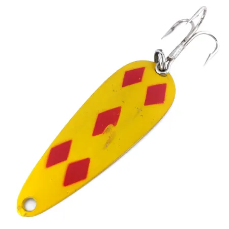 Sverianti tiksliai 28 g (1 oz), ši metalinė blizgė pasižymi laiko patikrinta Five of Diamonds spalvų gama. Geltonas emalis papuoštas penkiais raudonais rombais – šis raštas apibrėžia prekės ženklo identitetą nuo 1929 m. Žalvarinėje nugarėlėje įspausta „LEN THOMPSON NO. 2“ ir nurodyta Kanados kilmė. Šis modelis (kodas 10774) turi patikimą sidabrinės spalvos trišakį kabliuką su tvirtu žiedeliu. Būklė – solidi 4/5, matomos nežymios paviršiaus žymės dėl laikymo žūklės dėžutėje. Storas metalas užtikrina masalui būdingą lėtą svyruojantį judėjimą viliojant gilių vandenų plėšrūnus.
