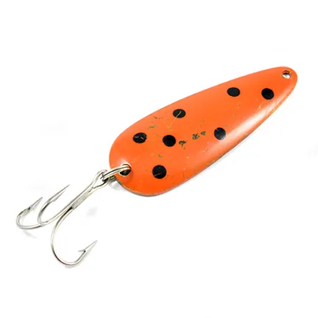 Ši 8 cm ilgio Kanadoje pagaminta klasikinė blizgė išsiskiria ryškia oranžine-raudona apdaila ir unikaliu juodų taškų raštu. Ant žalvarinės nugarėlės aiškiai įspaustas žymėjimas „LEN THOMPSON NO 2“ nurodo universalų masalą, skirtą tiek velkiavimui ežeruose gaudant upėtakius, tiek spiningavimui sekliuose vandenyse. Šis 28 g sveriantis egzempliorius, pažymėtas produkto kodu 2243, demonstruoja gamintojo dėmesį masalo balansui. Masalo būklė vertinama 4/5 – matomi nedideli paviršiaus įbrėžimai ir nežymūs dažų nutrynimai kraštuose, atsiradę laikant jį žūklės dėžutėje, kas suteikia jam savito charakterio. Blizgė turi tvirtą sidabrinį trišakį kabliuką, o jos konstrukcija užtikrina lėtą svyravimą, kuris puikiai imituoja sužeistą žuvelę. Žiedeliai išlieka tvirti ir patikimi, todėl masalas yra paruoštas kitam metimui arba užimti vietą kolekcijoje.