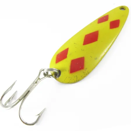 Penki raudoni rombai ryškiai nupiešti ryškiai geltoname fone ant šios Kanadoje pagamintos klasikos. Ši 28 g (1 oz) sverianti blizgė (prekės kodas 3681) pasižymi tradicine žalvario atspalvio nugara, kurios kolekcininkai ieško ankstyvuosiuose Len Thompson #2 modeliuose. Nuo pat prekės ženklo pradžios 1929 m. šie masalai buvo gaminami taip, kad imituotų mažos žuvelės profilį, o šis 8 cm (3 1/4") egzempliorius turi ryškias įspaustas raides kitoje pusėje. Aprūpinta sidabriniu trišakiu kabliu, ši blizgė yra pagrindinis įrankis spiningaujant ar velkiaujant lydekas ir ežerinius upėtakius. Five of Diamonds spalvinimas yra bene žinomiausias kataloge, skirtas užtikrinti gerą matomumą įvairiomis vandens sąlygomis. Įvertinta 4/5 būkle, geltoni dažai turi keletą pavienių įbrėžimų ir lengvų nusidėvėjimo žymių, nors metalo ir furnitūros konstrukcinis vientisumas išlieka puikus. Blizgė sukonstruota lėtam vartymuisi – tai techninė savybė, kuri gamintojui išliko nepakitusi beveik šimtmetį.