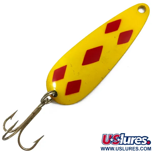 Penki ryškūs raudoni rombai ryškiai geltoname fone žymi dizainą, kuris tapo neatsiejama žvejybos dėžučių dalimi nuo pat įmonės gamybos pradžios 1929 metais. Ši 28 g (1 oz) sverianti Len Thompson #2 (produkto kodas 4653) yra pagaminta tokio storio, kuris užtikrina jai būdingą lėtą svyruojantį žaidimą traukiant masalą. Vartiklės nugarėlėje yra aiškus spaudas „LEN THOMPSON NO. 2“, atidengiantis žalvario spalvos pagrindinį metalą. Būklė vertinama 5/5, todėl dažai išlieka sodrūs, o furnitūra, įskaitant originalų trišakį kabliuką, yra puikiai išlaikyta. Šis 8 cm ilgio pavyzdys įrodo prekės ženklo reputaciją dėl balanso, todėl tai patikimas pasirinkimas spiningavimui ar velkiavimui gilesniuose vandenyse, kur dažnai laikosi lašišos ir plienagalviai upėtakiai.