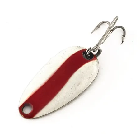 Ant žalvario spalvos nugarėlės aiškiai iškalta žymė „LEN THOMPSON NO. 6“, nurodanti šios mažos blinkės kilmę. Šis Kanadoje pagamintas masalas (produkto kodas 11312) pasižymi klasikine balta apdaila, papuošta ryškia įstriža raudona juosta priekinėje dalyje. Tiksliai 2,5 cm (1") ilgio ir lengvo 3,5 g (1/8 oz) svorio blinkė yra pagaminta iš tvirto žalvario pagrindo. Konstrukciją sudaro vienas sidabrinio atspalvio trišakis kabliukas, pritvirtintas platesniame gale tvirtu žiedeliu. Įvertinta 5/5 būkle, emalio ir metalo paviršiai atrodo puikiai išlaikyti ir švarūs. Istoriškai šios blinkės yra subalansuotos lėtam svyruojančiam judėjimui – tai technika, kurią žvejai naudoja imituodami mažas žuveles nuo pat prekės ženklo įkūrimo 1929 m. Viršutiniame siaurame gale yra tvarkingai išmušta skylutė valui tvirtinti.