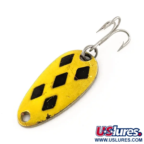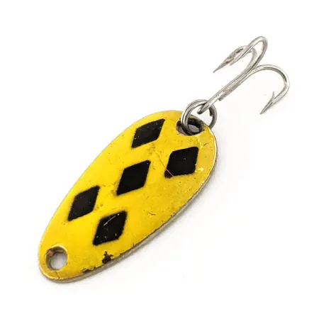 Ši Kanadoje pagaminta klasika pasižymi žalvarine nugarėle ir turi gilią „LEN THOMPSON NO. 6“ įspaudą, liudijantį ilgą gamintojo paveldą. Ši blizgė, kataloge žymima prekės kodu 11313, turi ryškiai geltoną emaliuotą paviršių, papuoštą penkiais ryškiais juodais rombais. Ji sveria 3,5 g (1/8 oz) ir yra kompaktiško 2,5 cm (1") ilgio, todėl idealiai tinka lengvam spiningavimui ar velkiavimui gaudant upėtakius ir ešerius. Eksponatas yra 5/5 būklės, dažai puikiai išsilaikę, o metalinis paviršius švarus. Nuo 1929 m. Len Thompson naudoja šią specifinę lašo formą mažoms žuvelėms imituoti – šis dizainas išliko beveik nepakitęs dešimtmečius. Masalas sukomplektuotas su aštriu, sidabrinio atspalvio trišakiu kabliuku, pritvirtintu standartiniu žiedeliu viršutinėje korpuso dalyje.