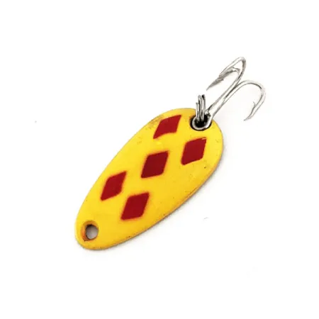 Tiesiogiai žalvario spalvos nugarėlėje įspaustas žymėjimas „LEN THOMPSON NO. 6“, nurodantis, kad ši blizgė pagaminta Kanadoje. Kompaktiško 2,5 cm (1") ilgio ir 3,5 g (1/8 oz) svorio masalas pasižymi puikiai atpažįstamu „Five of Diamonds“ raštu – penkiais raudonais rombais geltoname fone. Blizgės būklė yra išskirtinė, puikiai išlaikyta apdaila ir blizgus metalas nugarėlėje, todėl ji įvertinta 5/5. Prekės kodu 11369 pažymėtas masalas turi sidabruotą trišakį kabliuką, pritvirtintą žiedeliu, tinkantį spiningavimui ar lengvam velčiavimui gaudant upėtakius ir ešerines žuvis. Lašo forma ir storas žalvarinis korpusas yra „Len Thompson“ vizitinė kortelė nuo 1929 m., užtikrinanti subalansuotą darbą vandenyje. Dažai priekinėje dalyje išlieka ryškūs, sudarydami kontrastą poliruotai žalvarinei apačiai.