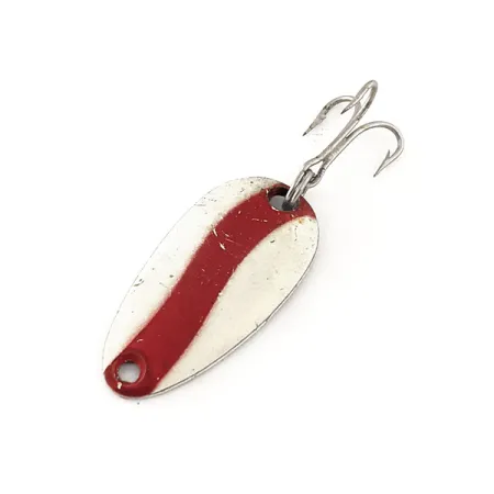 Ryški įstriža raudona juosta kerta šios kompaktiškos 2,5 cm (1 colio) vartiklės kreminę baltą pusę. Sverdama 3,5 g (1/8 oz), ši vintažinė rasta blizgė turi produkto kodą 11497 ir yra pagrindinis Len Thompson asortimento elementas. Kitoje pusėje yra žalvarinė apdaila su aiškiu antspaudu, nurodančiu „NO. 0“ modelį, nepaisant jo #6 katalogo žymėjimo. Žvejai dažnai pasitiki šiomis blizgėmis dėl joms būdingo lėto vartymosi metant ar velkiaujant tokias žuvis kaip upėtakiai ar ešerinės žuvys. Šis egzempliorius yra 5/5 būklės, matomas nedidelis paviršiaus nusidėvėjimas ir smulkūs dažų įtrūkimai, taip pat tamsėjimas ir oksidacija ant žalvario bei originalaus trišakio kabliuko. Lašo formos profilis yra klasikinio Len Thompson dizaino, gaminamo nuo 1929 m., siekiant imituoti mažas masalines žuveles.