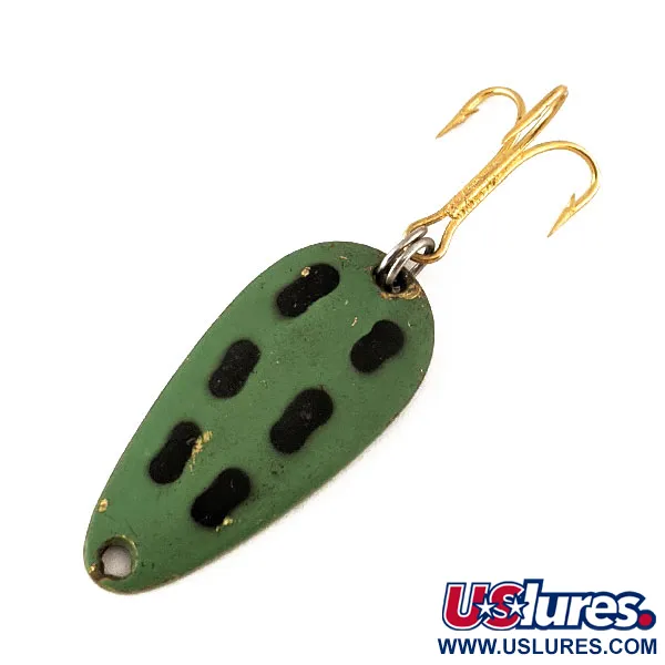 Žali dažai su ryškiomis juodomis ovaliomis žymėmis suteikia šios 5g (3/16oz) Len Thompson #7 blizgės priekinei daliai firminę išvaizdą. 3,4cm (1 1/4") ilgio masalas pasižymi tvirta žalvarine konstrukcija, matoma kitoje pusėje, kur metale įspaustas Len Thompson vardas ir aštuoneto formos logotipas. Konstrukciją sudaro aukso spalvos trišakis kabliukas, pritvirtintas sidabrinio atspalvio žiedeliu – tokia konfigūracija sukurta patvarumui spiningaujant ar velkiaujant įvairiuose gėlo vandens telkiniuose. Naudojimo žymės matomos kaip nedideli dažų nusitrynimai kraštuose ir lengvi paviršiaus įbrėžimai ant žalvarinės nugarėlės, todėl masalas vertinamas gerai išlaikyta 4/5 būkle. Ši Kanadoje pagaminta klasika, atpažįstama pagal prekės kodą 11191, turi štampuotą žalvarinį korpusą, kuris suteikia metalinį blizgesį kontrastuojantį su matiniu žaliu paviršiumi. Įspaustas užrašas nugarėlėje išlieka ryškus, pabrėžiantis vintažinio gamybos proceso kokybę.