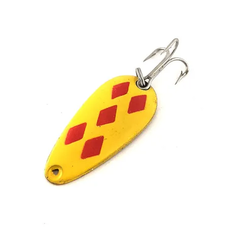 Penki raudoni rombai tiksliai nupiešti ant ryškiai geltonos emalės, sukuriant ikonišką „Five of Diamonds“ raštą, kuris išgarsino šias kanadietiškas blisges nuo 1929 metų. Šis egzempliorius yra Len Thompson #7, kurio ilgis 3,4 cm (1 1/4"), o svoris – 5 g (3/16 oz). Kita pusė pasižymi blizgia žalvario apdaila, kurioje giliai įspaustas gamintojo ženklas „LEN THOMPSON No.7“, patvirtinantis autentišką kilmę. Sukurta įvairiems žvejybos būdams, įskaitant spiningavimą ir velčiavimą, masalas turi sidabro spalvos trišakį kabliuką, pritvirtintą tvirtu žiedeliu. Registruota produkto kodu 11533, blisgė yra 5/5 būklės, išlaikiusi lygų paviršių ir didelio kontrasto spalvas. Kompaktiškas profilis yra specialiai pasvertas taip, kad vandens sluoksnyje imituotų mažas žuveles.