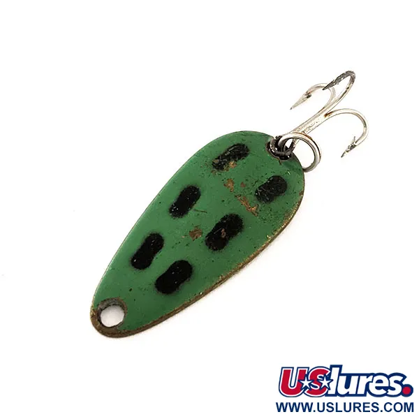 Ši 3,5 cm (1 1/2 colio) kanadietiška blizgė pasižymi ryškiu varliuko raštu, žolės žalumo viršutine dalimi ir išskirtinėmis juodomis ovaliomis dėmėmis. Žalvarinio atspalvio apatinėje dalyje aiškiai įspaustas „LEN THOMPSON NO 7“ žymėjimas, nurodantis gamintojo, kuris žvejų dėžutėse karaliauja nuo 1929 m., paveldą. 5 g (3/16 oz) svorio blizgė sukurta lėtam vartymuisi, imituojančiam smulkią žuvelę. Sidabro spalvos trišakis kablys pritvirtintas patikimu žiedeliu, o bendra būklė yra solidi 4/5, rodanti nedidelius naudojimo žymius. Produkto kodas 11545; ašaros forma ir žalvario pagrindas yra klasikiniai Len Thompson serijos bruožai.