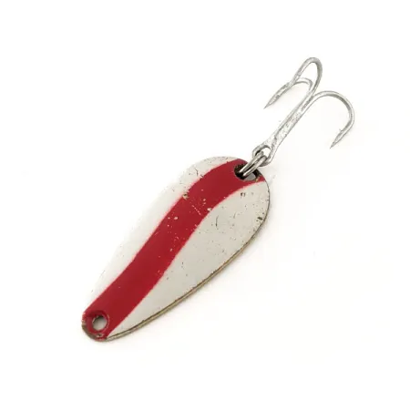 Ant žalvarinės nugarėlės išspaustas užrašas „LEN THOMPSON No. 7“ identifikuoja šią vartiklę kaip klasikinį Kanados gamybos masalą, gaminamą gamintojo, veikiančio nuo 1929 m. Ryški raudona banguota juosta baltame fone sukuria kontrastingą raštą, skirtą pritraukti plėšrūnų, pavyzdžiui, lydekų ar ežerinių upėtakių, dėmesį. Tiksliai 3,5 cm (1 1/2 colio) ilgio lašelio formos profilis yra gerai atpažįstamas daugelio patyrusių žvejų masalų dėžutėse. 5 g (3/16 oz) svoris užtikrina stabilų pojūtį metant ar velkiaujant įvairiomis sąlygomis. Balti dažai turi keletą nedidelių įbrėžimų dėl amžiaus, todėl būklė vertinama solidžiu 5/5 balu. Šis No. 7 modelis, žinomas dėl savo charakteringo lėto svyruojančio žaidimo, yra patikimas pasirinkimas viliojant pasyvias žuvis. Masalas turi tvirtą sidabrinį trišakį kabliuką, o jo prekės kodas – 11642.