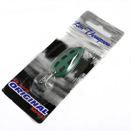 Green Frog raštas su tamsiomis ovaliomis dėmėmis būdingas šiai Len Thompson #8 vartiklei, kuri yra klasikinio dizaino pavyzdys Šiaurės Amerikos gėlavandenei žūklei. 7 g (1/4 oz) svorio ir 4 cm (1 1/2") ilgio kompaktiškas masalas priklauso Original Series serijai ir yra pažymėtas prekės kodu 0741. Šis egzempliorius yra nenaudotas, originalioje gamyklinėje pakuotėje, kurioje aprašoma ilga prekės ženklo istorija Lakombe, Albertoje, Kanadoje, siekianti 1929 m. Formos ypatumai užtikrina lėtą vartymosi akciją traukiant ar velčiaujant, imituojant masalinės žuvelės judesius. Kitoje kortelės pusėje matomas Thompson-Pallister Bait Co. Ltd. logotipas ir specifinis žymėjimas 'No. 8 GF'. Vartiklė sukomplektuota su aštriu trišakiu kabliuku, išlaikant originalią gamyklinę furnitūrą.