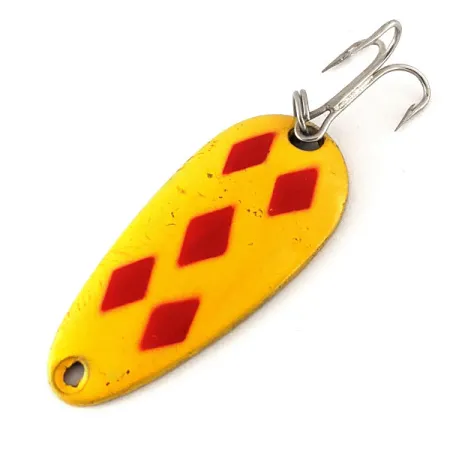 Penki ryškūs raudoni rombai išsiskiria šviesiai geltoname šio kanadietiško masalo emalyje. 4 cm (1 1/2") ilgio ir 7 g (1/4 oz) svorio #8 dydis yra pagrindinis įrankis žvejams, gaudantiems įvairias gėlavandenes žuvis spiningaujant ar velkiaujant. Kitoje pusėje matoma švari žalvario apdaila su aiškiai įspaustu „LEN THOMPSON NO. 8“ ženklu, liudijančiu gamybos paveldą, prasidėjusį 1929 m. Produktas, pažymėtas kodu 12340, yra 5/5 būklės, lygiu paviršiumi ir aiškiomis dažų linijomis. Blizgė sukomplektuota su sidabrinės spalvos trišakiu kabliuku ir žiedeliu. Šios žalvarinės blizgės istoriškai vertinamos dėl savo lėto svyruojančio žaidimo. Priekinė kilpelė yra švari, todėl ją lengva pritvirtinti prie suktuko ar valo.