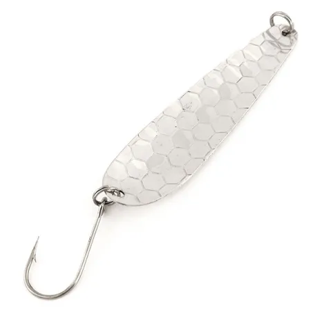 Klasikinis kaltas šešiakampis raštas dengia šios sidabruotos žalvarinės blizgės paviršių – tokia konstrukcija skirta maksimaliai atspindėti šviesą velkiaujant giliuose vandenyse. Ši 14 g (1/2 oz) svorio ir 9,5 cm (3 3/4") ilgio „Len Thompson Northern King NK28“ yra puikiai išlaikytas egzempliorius, atpažįstamas pagal produkto kodą 12691. Masalas yra 5/5 būklės, pasižymintis ryškia ir švaria apdaila, būdinga tikram sidabravimui, kurį šis Kanados gamintojas naudoja nuo pat serijos pasirodymo 1984 m. Šis konkretus modelis žvejų vertinamas dėl lėto svyruojančio darbo, kuris ypač veiksmingas gaudant ežerinius upėtakius, lašišas ir plieningalves lašišas. Įgaubtoje vidinėje pusėje prie uodegos esantis įspaudas „NK 28“ išlieka ryškus ir aiškiai įskaitomas. Furnitūrą sudaro vienas didelis kablys, pritvirtintas tvirtu žiedeliu, o galvutėje yra atitinkama kilpelė valui ar suktukui tvirtinti.