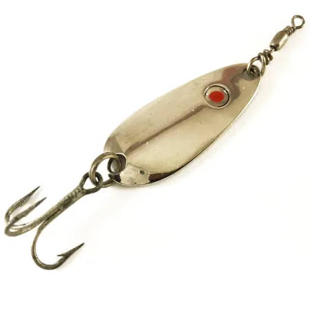 Nikeliuotas paviršius suteikia klasikinį, itin ryškų spindesį šiai 3,5 cm (1 1/2") blizgei, kuri išlieka viena mėgstamiausių tarp JAV Vakarų pakrantės žūklės įrankių istorijos kolekcininkų. Įgaubtoje nugarėlėje aiškiai išspaustas 'Les Davis Hotrod' pavadinimas šalia 1/6 oz žymos, nors standartinis katalogo svoris šiam 3605 prekės kodui yra 3/16 oz (5 g). Ryškus raudonas taškas ant poliruoto priekinio paviršiaus prie kilpelės valui tarnauja kaip paprastas, bet veiksmingas atakos taškas metaliniame korpuse. Šis JAV pagamintas egzempliorius yra 5/5 būklės, pasižymi blizgiu paviršiumi ir puikiai išlaikytu vielute apvyniotu suktuku. Originalus trišakis kabliukas pritvirtintas tvirtu žiedeliu, be jokių naudojimo ar senėjimo žymių, o tai rodo puikų išsaugojimą dar nuo tų laikų, kai prekės ženklas nebuvo perėjęs Luhr Jensen žinion.