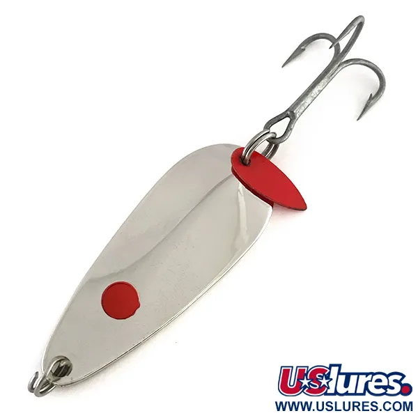 Įgaubtoje lapelio pusėje aiškiai įspausti „Les Davis“ ir „Hotrod“ pavadinimai, žymintys šį 8254 modelį kaip klasikinį Ramiojo vandenyno šiaurės vakarų žvejybos istorijos pavyzdį. Aukšto blizgesio nikelio apdailą papildo vienas raudonas taškas priekinėje dalyje ir firminis raudonas plastikinis „flipperis“, pritvirtintas prie galinio žiedo kartu su trišakiu kabliuku. 1/2 oz (14 g) svorio ir 2 1/4" (5,5 cm) ilgio masalas pagamintas ant tvirto žalvarinio pagrindo, kas yra kokybiškos gamybos „Luhr Jensen“ gamykloje JAV ženklas. Šis egzempliorius yra puikios būklės (5/5), su atspindinčiu paviršiumi ir švariais, aštriais kabliukais. „Hotrod“ užrašas yra ryškus ir įskaitomas, be nusidėvėjimo žymių, kurios dažnai pasitaiko ant senovinių velkiavimo blizgių.