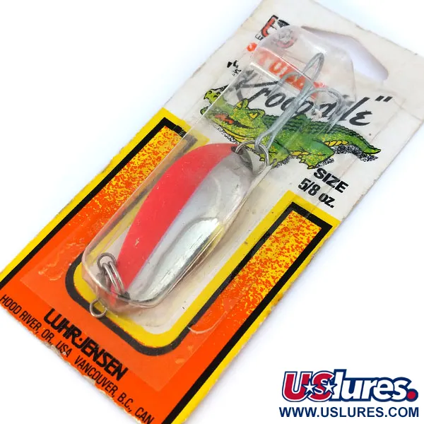 Sverianti 18 g (2/3 oz), ši Luhr Jensen Lil' Kroc (Krocodile Stubby) UV pasižymi giliu, šaukšto formos profiliu, kuris skiria „Stubby“ variantą nuo plonesnių modelių. Šis 5,5 cm (2 1/4") masalas, kurio produkto kodas 10793, yra padengtas ryškia Nikelio / Raudona apdaila, skirta sukurti stiprius blyksnius metant ar vilkiaujant. Išskirtinė techninė savybė atsiskleidžia po ultravioletine šviesa, kur raudona juosta reaguoja su dideliu liuminescencija, kas yra privalumas išlaikant matomumą giliuose vandens sluoksniuose. Masalas turi tvirtą trišakį kabliuką ir sutvirtintus žiedelius, pagamintus pagal patvarius Hood River, Oregon gamyklos standartus. Šis egzempliorius yra originalioje pakuotėje, nenaudotas, jo būklės įvertinimas – 6. Kortelės nugarėlėje yra klasikinė krokodilo simbolika ir gamybos informacija JAV bei Kanadai.