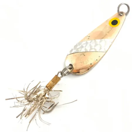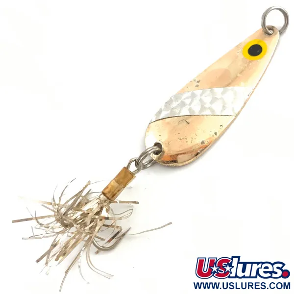 10 g svoris paverčia šią Lindy Finsel universaliu pasirinkimu įvairioms gėlavandenėms žuvims. Šios 5,5 cm blisgės auksinė danga pasižymi išskirtine sidabrine žvynų rašto juosta per vidurį, suteikiančia kontrastingą tekstūrą atspindinčiam paviršiui. Ryški geltona akis su juodu vyzdžiu yra netoli viršutinio tvirtinimo taško, o kitoje pusėje aiškiai įspaustas Finsel pavadinimas, nurodantis jos kilmę iš Lindy / Little Joe JAV. Šis konkretus modelis, identifikuojamas prekės kodu 4527, ant trišakio kabliuko turi sidabrinę blizgučių uodegėlę, suteikiančią subtilų mirgėjimą. Įvertinta 4/5 būkle, aukso danga rodo nedidelius amžiaus požymius su švelniu, autentišku spindesiu. Konstrukciją papildo tvirti žiedeliai, sukurti atlaikyti stipraus laimikio trauką.