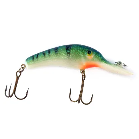 Tiksliai 1/4 oz (7 g) sveriantis Lindy Shadling yra puikus Lindy / Little Joe devintojo dešimtmečio Amerikos meistriškumo pavyzdys. 5 cm (2") kūnas padengtas sodriu ešerio raštu, kuriame žalia blizgi nugara derinama su ryškiomis vertikaliomis juostomis ant kreminės spalvos pilvo. Po smakru esanti ryškiai oranžinė dėmė tarnauja kaip klasikinė taikinio vieta sekančioms žuvims. Šis konkretus modelis, pažymėtas prekės kodu 11104, yra 5/5 būklės, išlaikęs originalų dažų ir furnitūros blizgesį. Ilgas, integruotas liežuvėlis apibūdina Shadling dizainą, kuris tapo pagrindiniu įrankiu žvejams, gaudantiems giliavandes žuvis. Kolekcionieriai įvertins išsaugotą blizgų paviršių, kuris buvo Lindy to meto masalų firminis bruožas.
