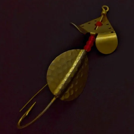 Žibanti kalto žalvario apdaila ir pagrindinis lašo formos lapelis iškart išduoda, kad tai retas Lindy / Little Joe egzempliorius. 7 g svorio ir 7 cm ilgio „Skitter-Buzz Weedless“ pasižymi specialia deltos formos propelerio galvute su nedidelėmis apskritomis perforacijomis ant sparnelių. Trys permatomi raudoni karoliukai ant centrinės vielinės ašies sukuria ryškų akcentą tarp galvutės ir kalto korpuso. Šis JAV pagamintas masalas, žymimas prekės kodu 24094, turi vienšakį kabliuką su vieline apsauga, skirta žvejybai per vandens augmeniją. Auksinio atspalvio metalinės detalės išliko ryškios ir švarios, todėl šis egzempliorius įvertintas 5/5 būkle. Tai puikiai išlaikytas paviršinis masalas, kurio besisukanti galvutė traukiant paviršiumi palieka pėdsaką, o didelis kaltas lapelis atspindi šviesą iš apačios.
