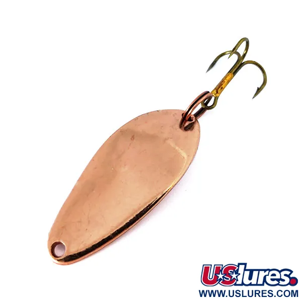 Išstampuota iš storasienio metalo ir padengta šiltu vario tonu, ši 7g (1/4 oz) blizgė, identifikuojama produkto kodu 10357, yra ankstyvųjų „Seneca Lure“ kompanijos gamybos metų įrodymas. 4cm (1 1/2") ilgio blizgė turi ikonišką „Wigl-Lure“ įspaudą įgaubtoje pusėje – tai detalė, būdinga originalioms „Seneca“ gamybos „Little Cleo“, prieš prekės ženklą perimant „Acme“ devintojo dešimtmečio pradžioje. Kolekcionieriai įvertins užrašų ryškumą, aiškiai nurodantį, kad tai JAV pagamintas „A Seneca Lure“ masalas. Lašo formos korpusas sujungtas su tvirtu žiedeliu ir aštriu trišakiu kabliuku, išlaikant originalią komplektaciją. Šis egzempliorius yra puikios būklės (įvertinimas 5/5), demonstruojantis aukštos kokybės padengimą ir meistriškumą, būdingą vintažiniams amerikietiškiems žūklės įrankiams. Varinis paviršius pasižymi švariu, atspindinčiu blizgesiu, kuris pabrėžia unikalią štampavimo detale.